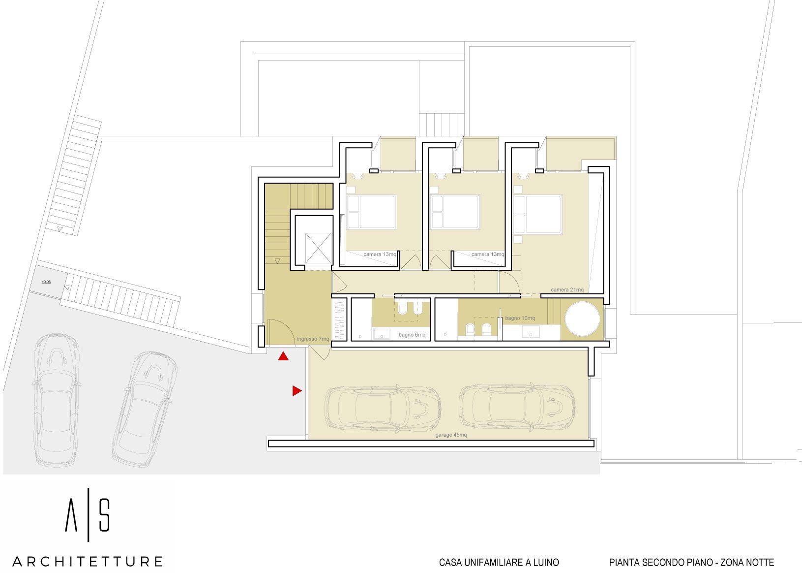 Il secondo piano è il livello della zona notte, le camere sono affacciate a sud, ogni una delle quali è caratterizzata dalla presenza di una piccola loggia esterna privata, a ridosso delle camere ma sul lato opposto si trova una zona tecnica contenente i bagni.