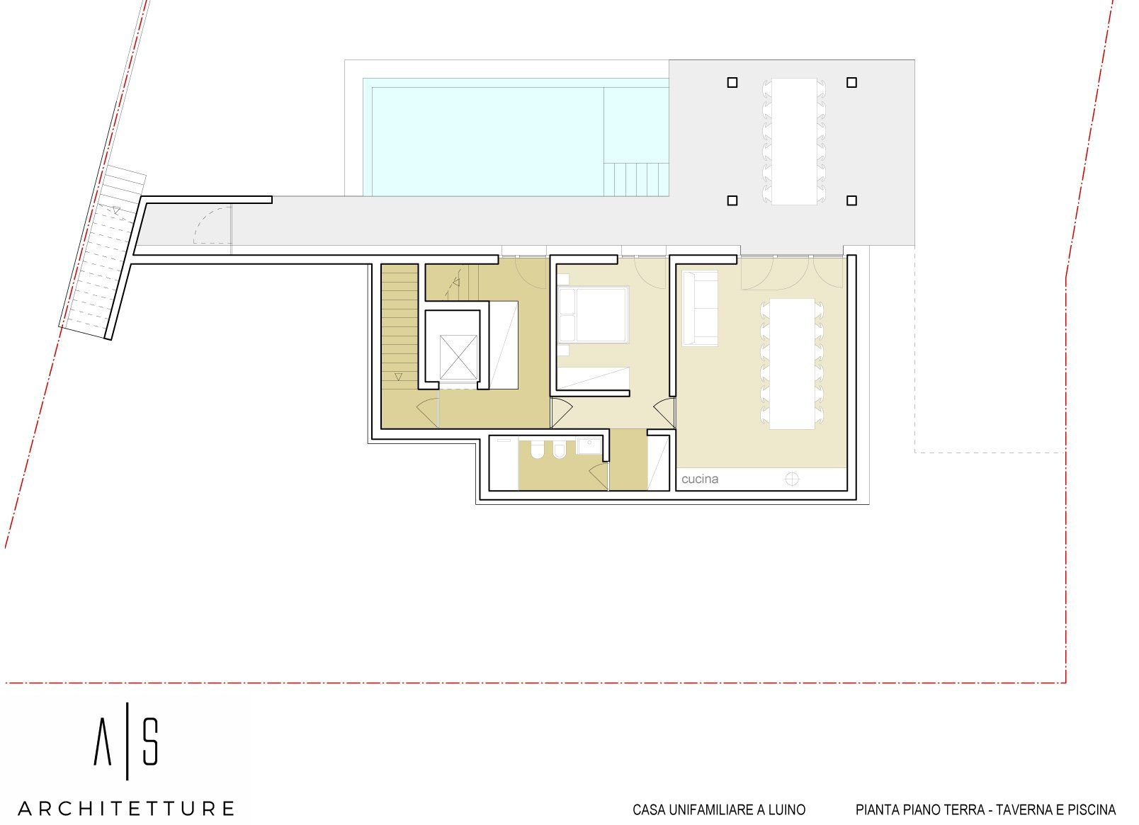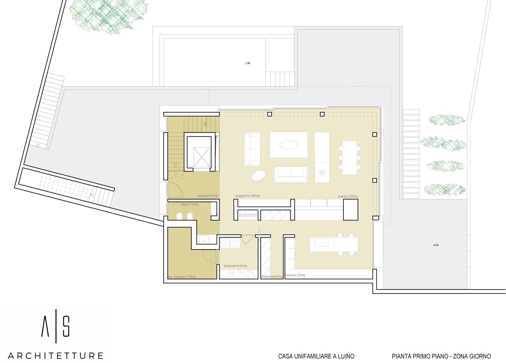 Il primo piano è dedicato alla zona giorno, caratterizzato da ampie vetrate, le zone soggiorno, pranzo e cucina, si affacciano su un grande terrazzo che circonda tutto l’edificio, garantendo una circolazione fluida ed un accesso comodo e diretto al giardino, che si trova alla quota del piano terra; nella parte contro terra, sono posizionati gli spazi tecnici e di servizio.